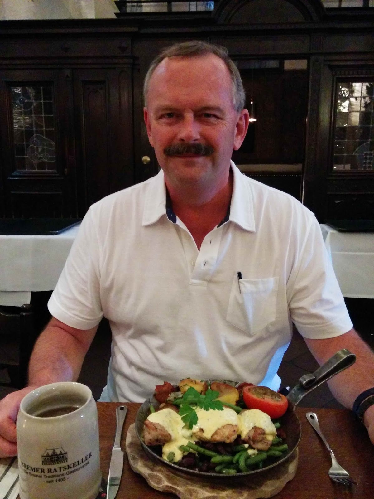 | In the Ratskeller, Larry with his dinner of pork and beef medallions - and his half litre of beer! |