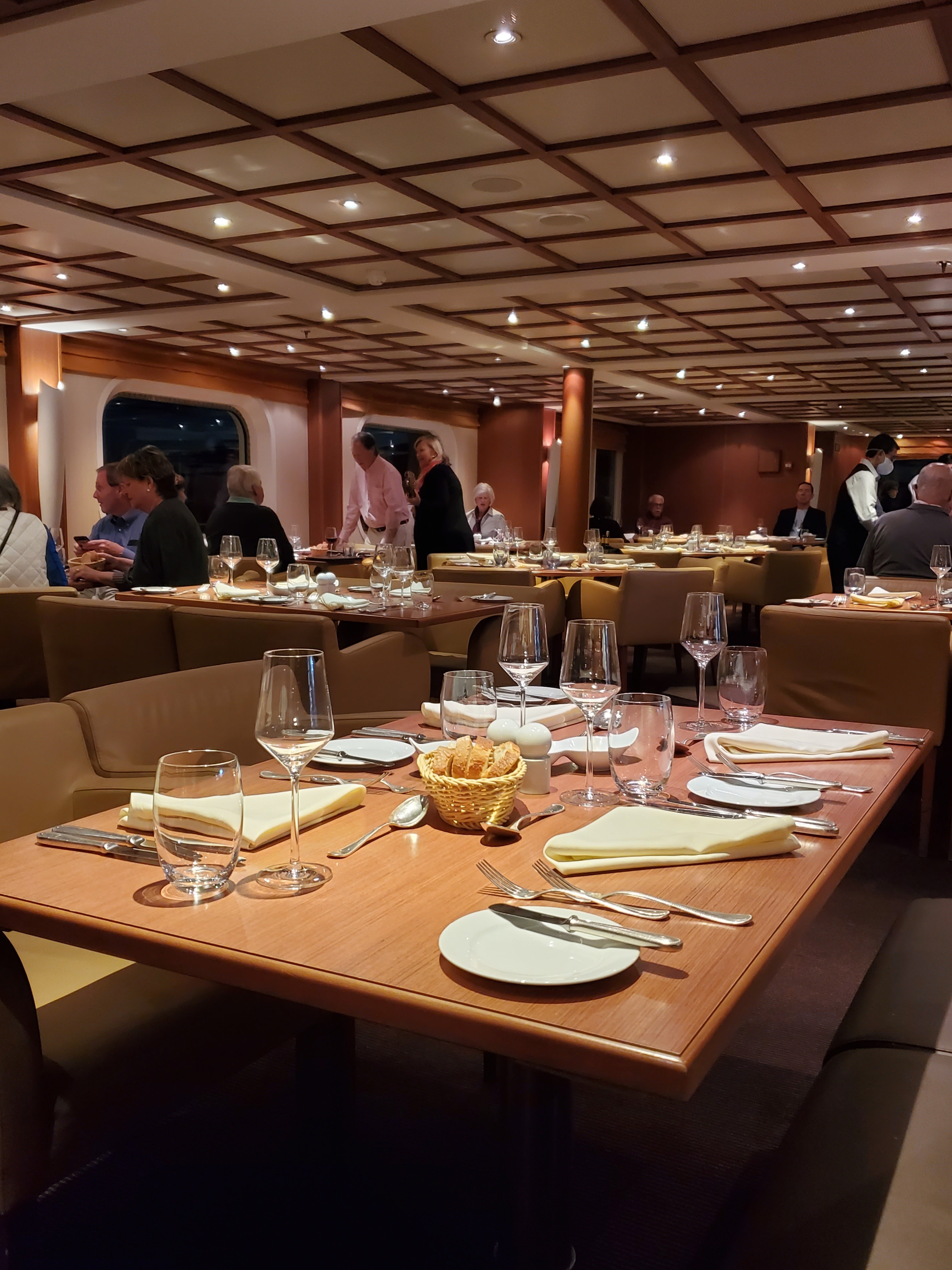 Later, much later that evening, we had our first dinner at The Grill by Thomas Keller, the main specialty dining venue on the ship. The room is quite small and is set up to look like a 1950s wood-paneled train car. We have had varying reports on the quality, especially of the signature Rib Eye Steak, but thought we would still have our own experience to see how it compared.