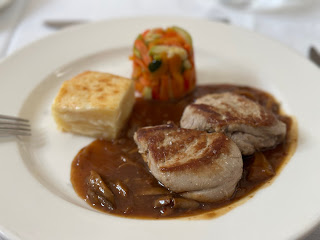 The main course was pork medallions with potato gratin and a vegetable stack, also great.